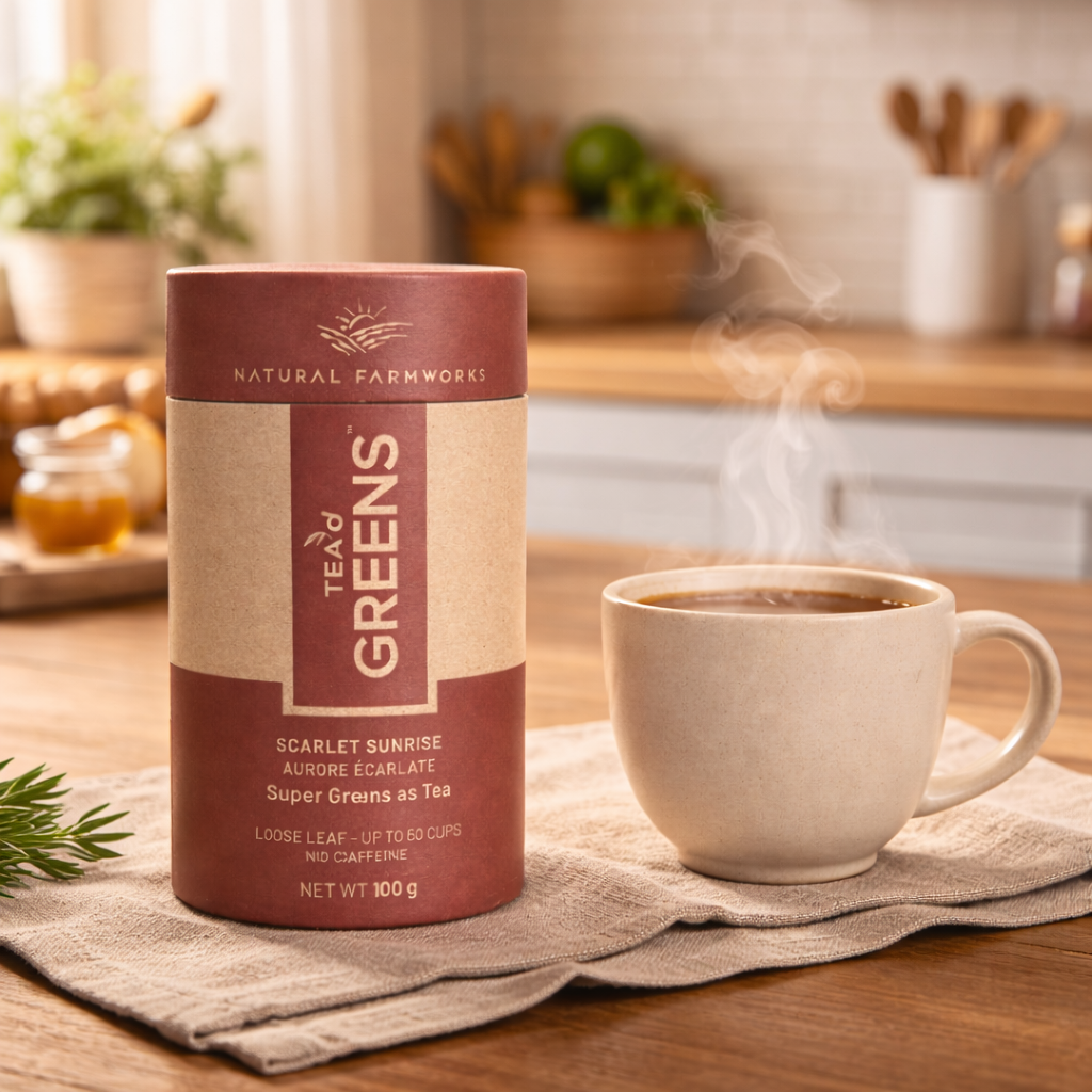 Scarlet Sunrise blends farm-grown young greens with hibiscus, rosehips, cinnamon, and rose petals for a vibrant cup with natural tartness and gentle warmth. Smooth, light, and refreshing—a beautiful rosy hue with no bitterness or heaviness.